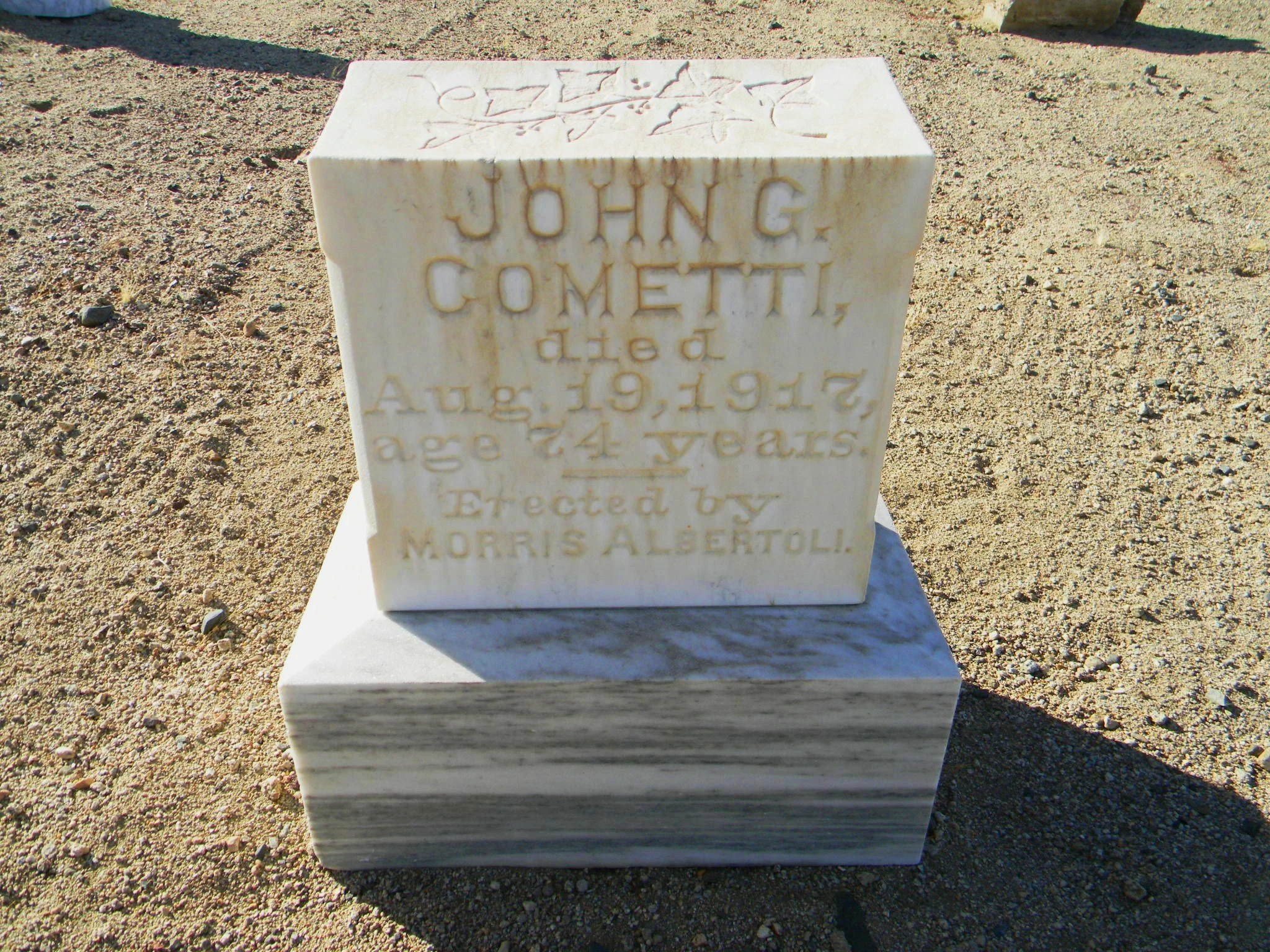 The first burial at the Woodman of the World Cemetery was Giovanni B. Cometti. Born in Italy in 1843, naturalized in Amador County in 1880, and passed away August 19, 1917. John’s funeral was held at Hall’s Undertaking Parlor in Big Pine.